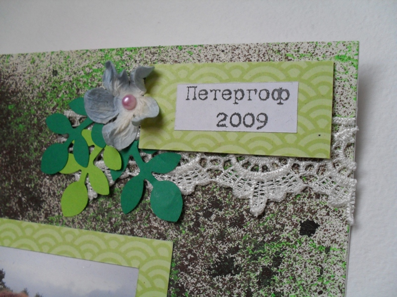 Итак, первый разворот и его обязательные элементы - кружево или шнур (бечевка) на выбор. Посвятили Петергофу. Решила взять общие планы