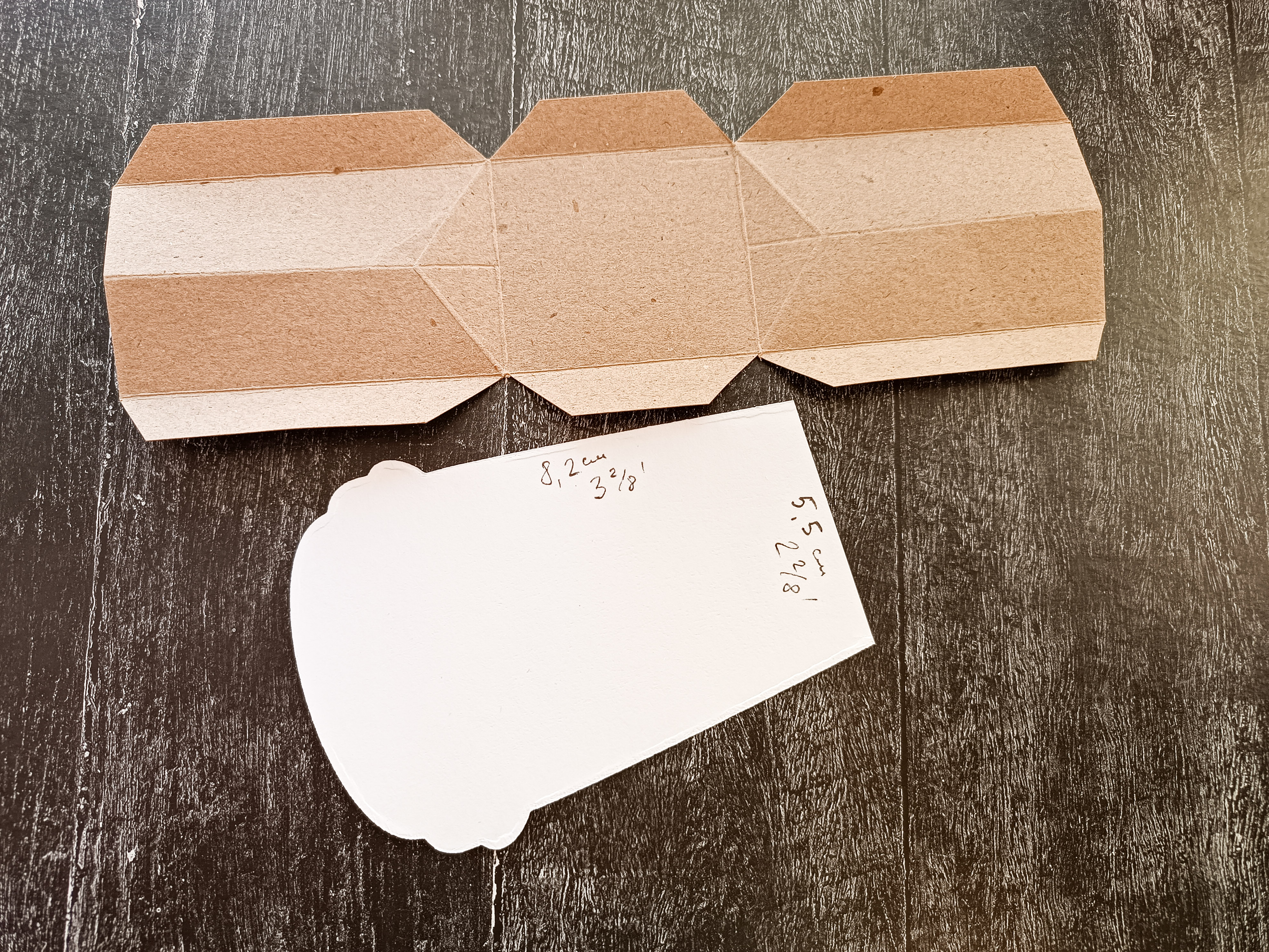 3. Далее подготовила боковую часть. Я взяла полоску шириной 3 дюйма. Пробиговала ее вдоль, отступив от краев по ½ дюйма (это около сантиметра). Дальше отмерила расстояния согласно боковым сторонам и основанию стаканчика с отрезанным донышком. У меня получилось 8,2 см-5,5см-8,2 см. На пересечении линий срезала уголки. Чтобы стакан можно было закрепить сверху, необходимо сделать линии сгиба на боковых частях. На фото 2 возможных варианта.